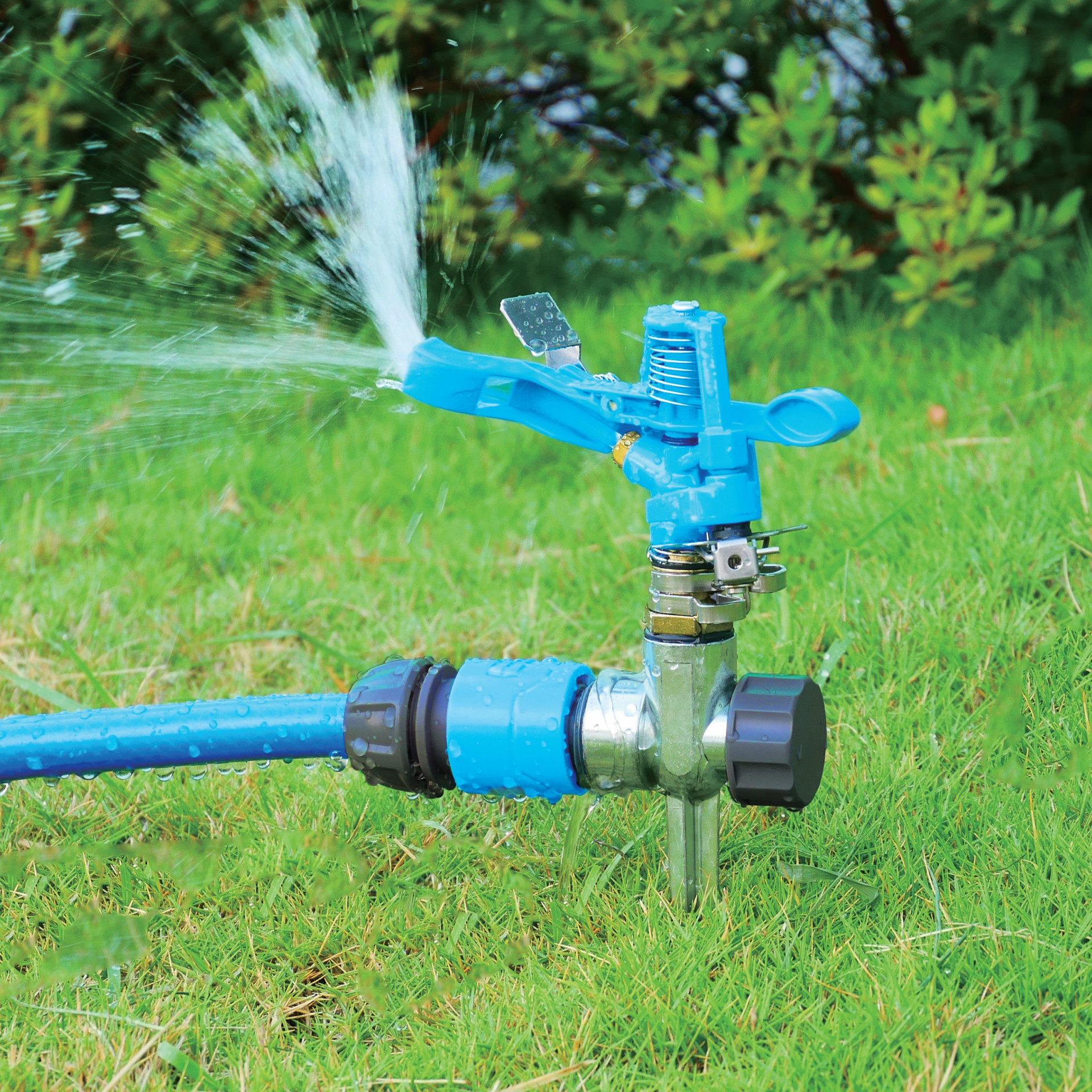 - Sturdy metal two-way spike allows connection with more sprinklers for watering large area.